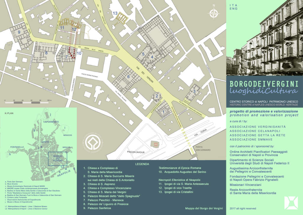 È così che nasce la mappa “Borgo Vergini – Luoghi di Cultura”, realizzata dalle associazioni Celanapoli, Getta la rete, SMMAVE e VerginiSanità, ognuna delle quali gestisce la fruizione e la valorizzazione di un sito culturale monumentale.