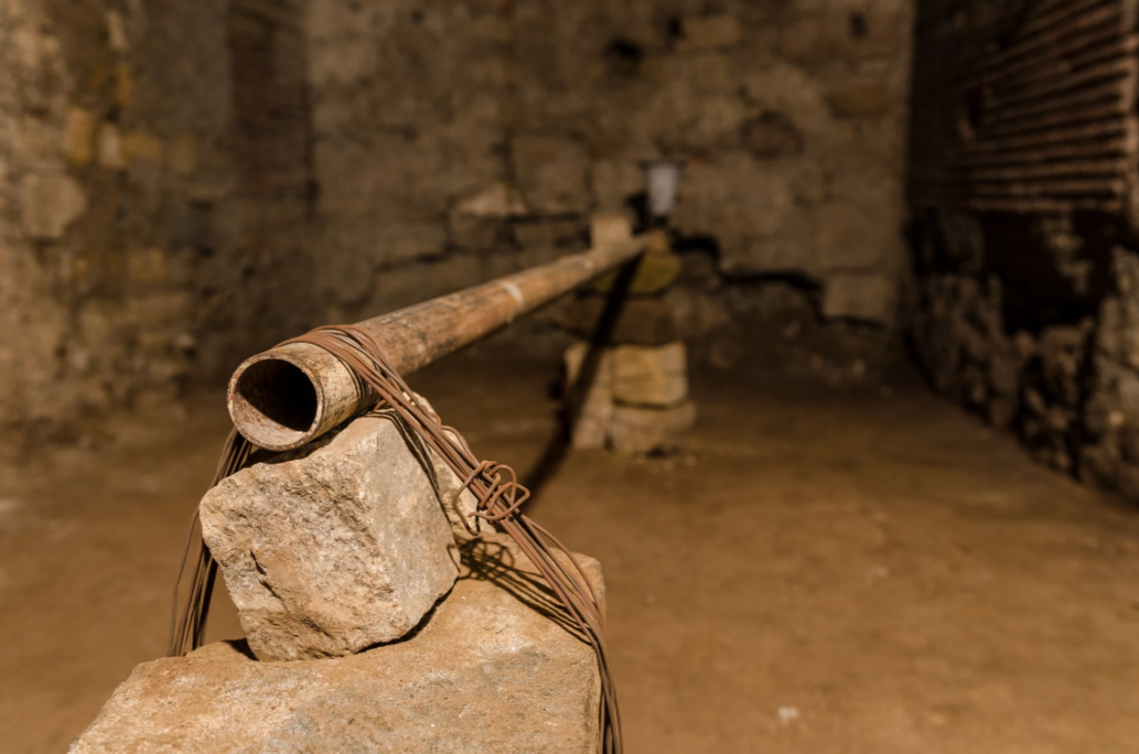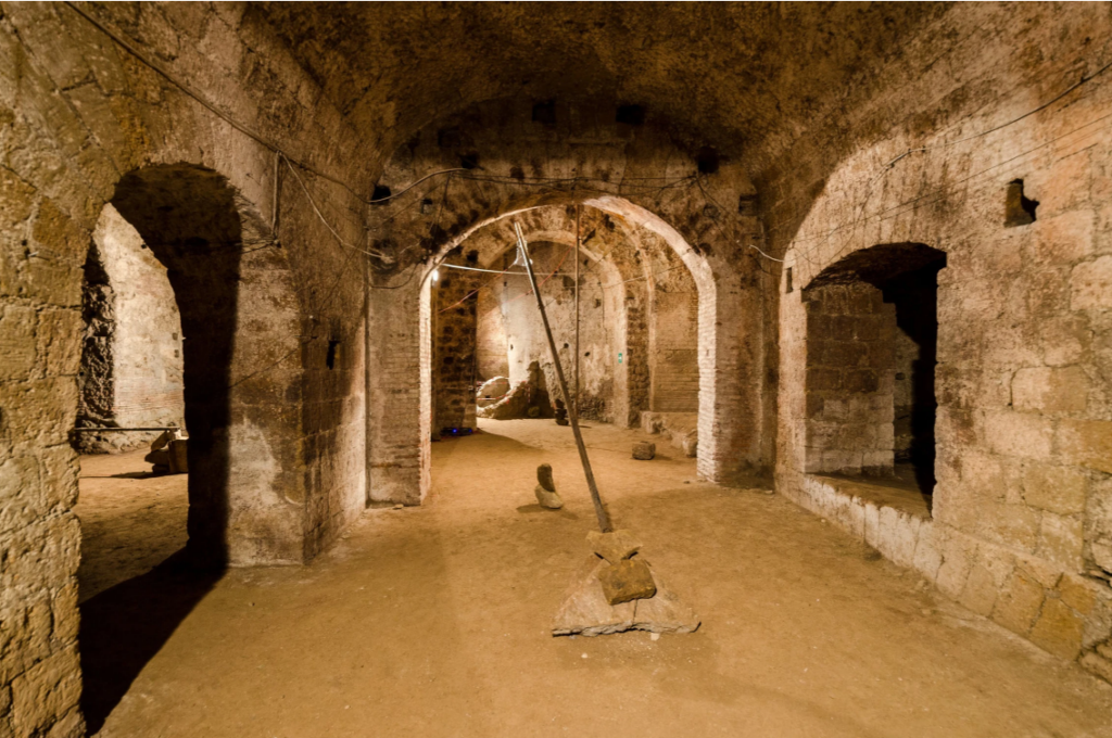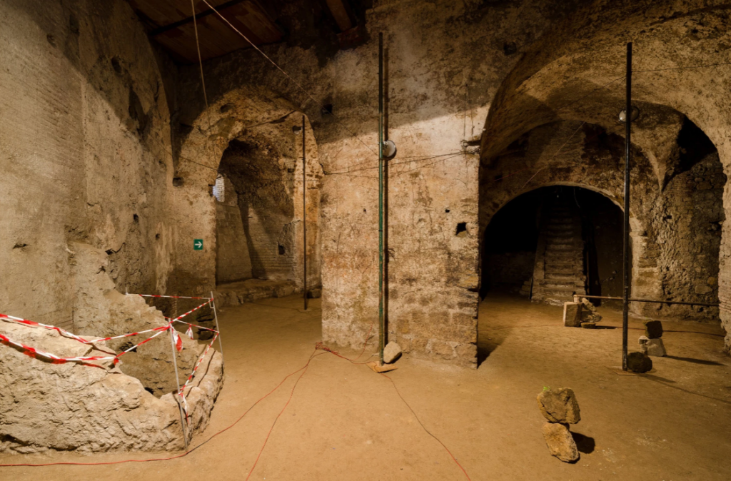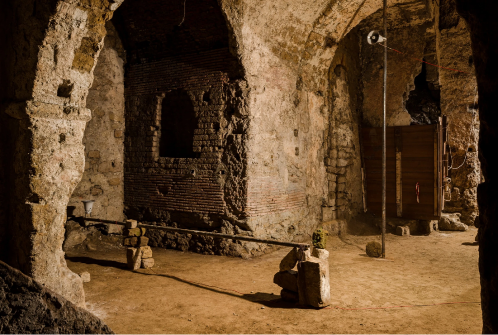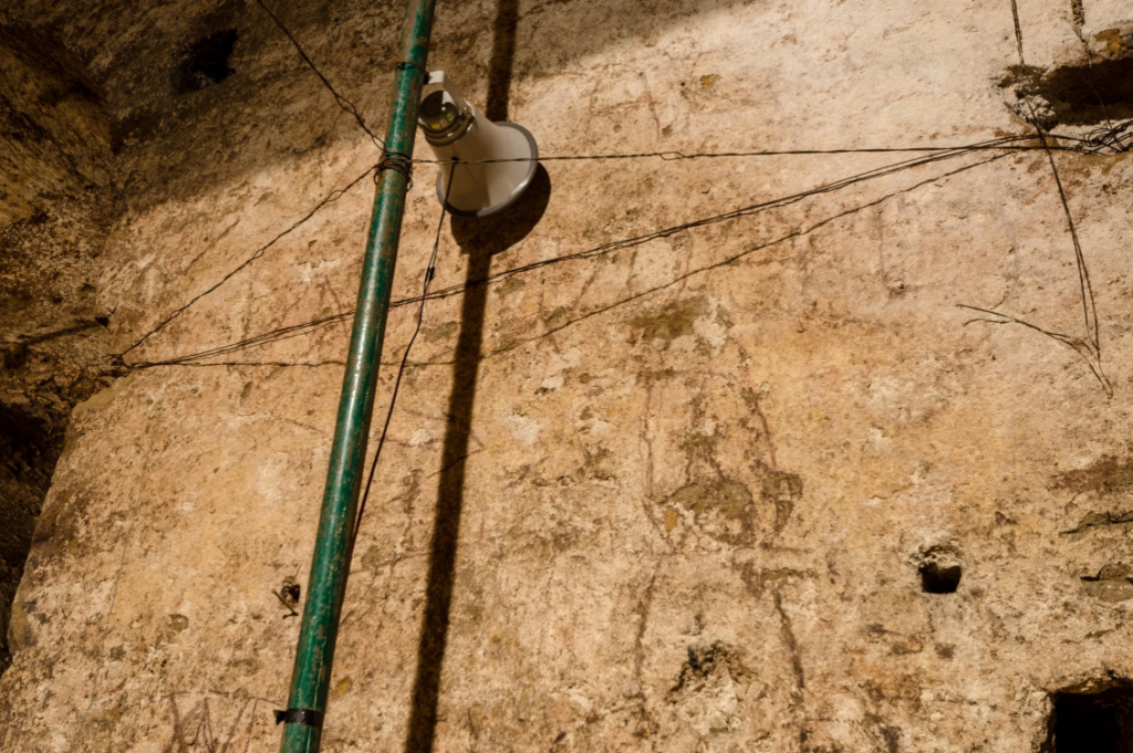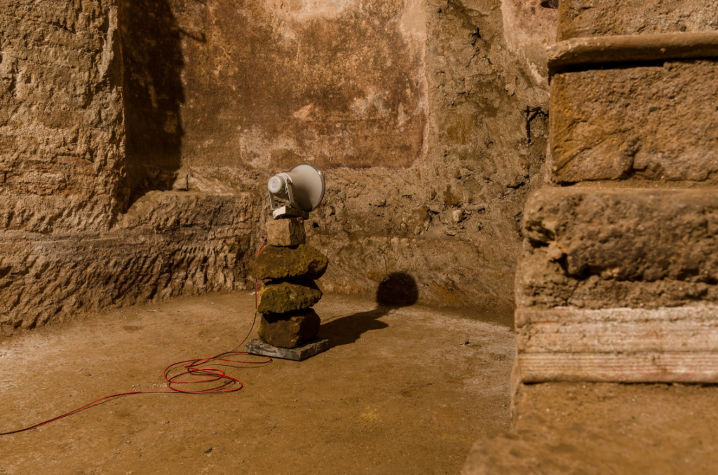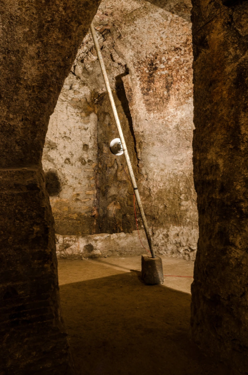 Blind Horizon è il risultato di un periodo di residenza e di ricerca che ha visto Arturo Hernández Alcázar esplorare diverse zone di Napoli, a partire dal borgo Vergini-Sanità per arrivare alle aree vesuviane, ai Campi Flegrei e alle montagne del Serino, ripercorrendo idealmente l’antico percorso dell’acquedotto. L’artista ha modellato la sua linea di ricerca pregressa sulle suggestioni provenienti dal territorio e dal sito archeologico che ospita la mostra, concependo un’installazione che integra forme smaterializzate – quali il suono – a forti presenze fisiche, al fine di porre una riflessione sulle idee di controllo, manipolazione delle forze e gestione del potere. L’orizzonte del titolo è quindi quello disegnato dall’antico acquedotto, un orizzonte governato delle imponenti strutture idrauliche che attraversavano il paesaggio per poi inglobarsi nell’ambiente urbano, esempio di un dominio esercitato sul territorio che al tempo stesso cerca di assecondarne la morfologia. Nell’analisi di un eterno processo che avanza fra costruzioni e distruzioni, fra storia naturale e storia politica, Arturo Hernández Alcázar interpreta le stratificazioni culturali e geologiche che caratterizzano Napoli proponendo un’opera che insiste sull’idea di una forza erosiva latente e che offre un’inedita interpretazione di questo affascinante ritrovamento archeologico e della sua funzione originaria.