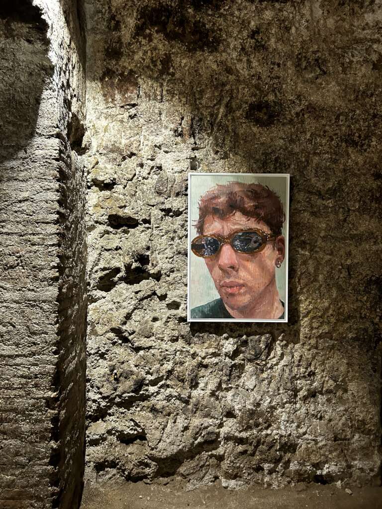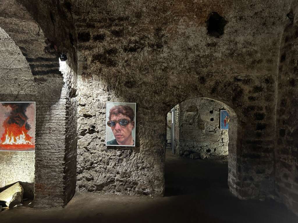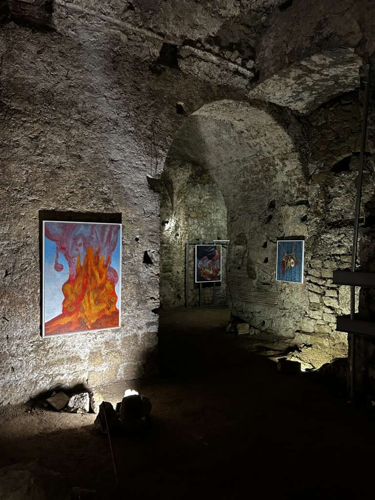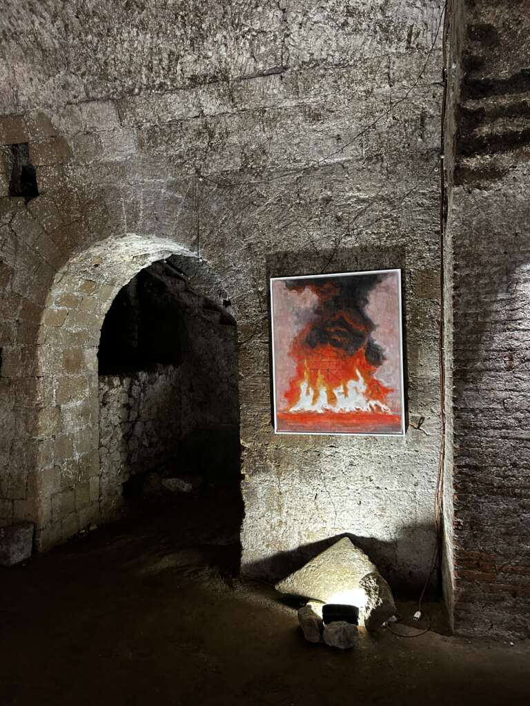 Ed è proprio l’inserzione di momenti di cortocircuito visivo, presenti in forma di esplosioni vulcaniche, che consentono una veridica lettura delle immagini, non “restaurate”, “abbellite” o “ritoccate”. Tramite velocità dell’esecuzione pittorica e l’inquadratura filmica, le opere chiedono all’osservatore di unire i frammenti di vita e le storie stratificate nel sottosuolo napoletano per contemplare l’esistenza di due linee temporali sovrapposte, imperfette, comunicanti e in perpetua evoluzione