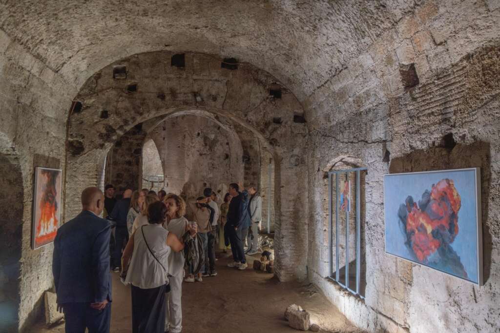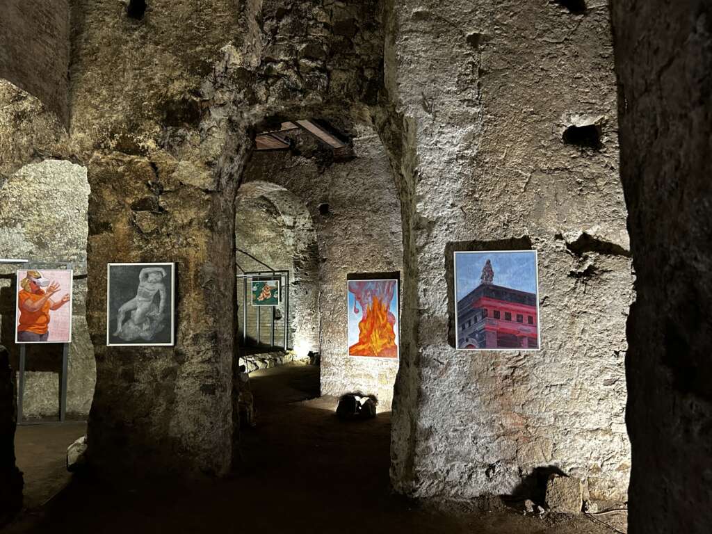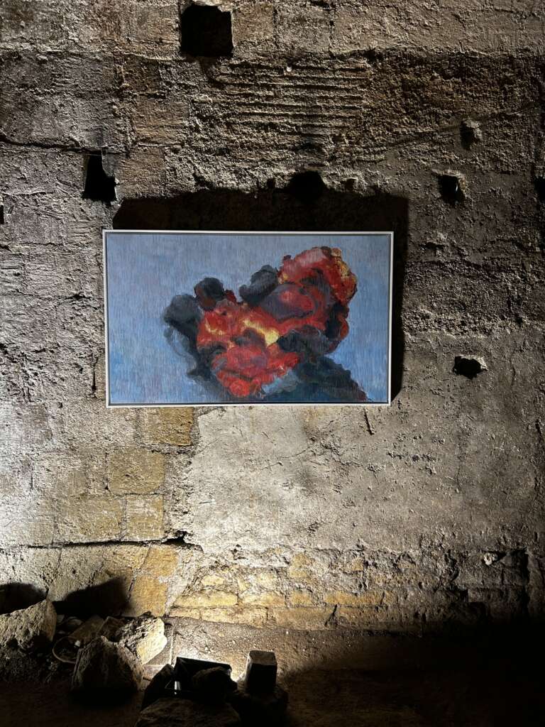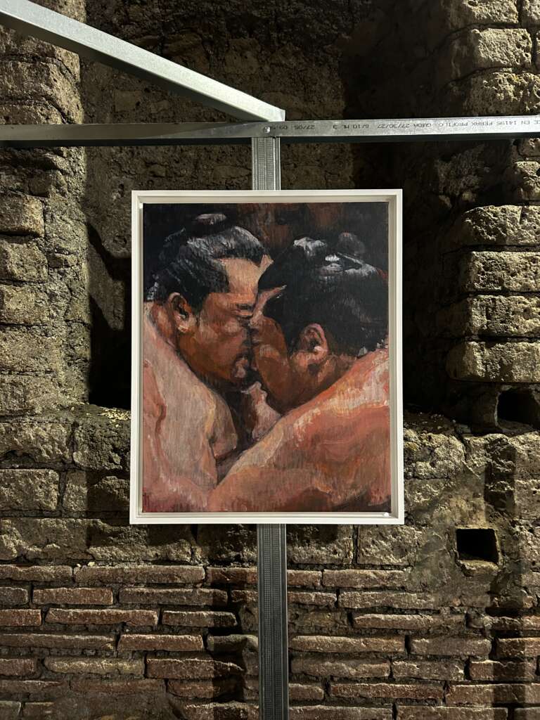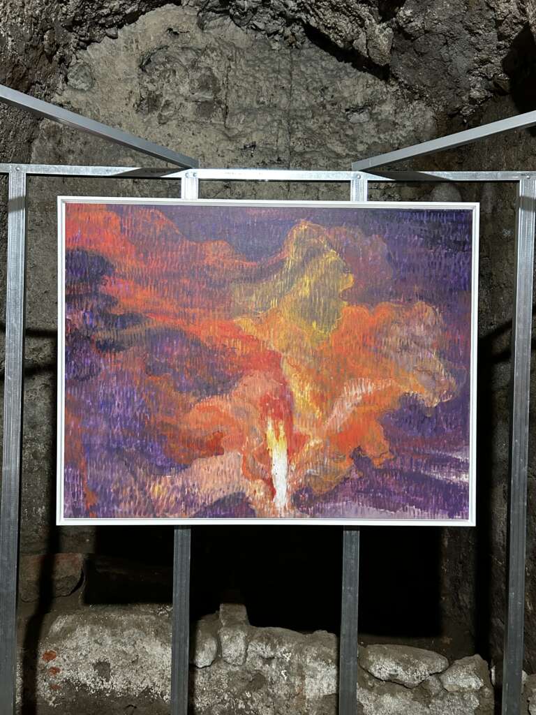 Ed è proprio l’inserzione di momenti di cortocircuito visivo, presenti in forma di esplosioni vulcaniche, che consentono una veridica lettura delle immagini, non “restaurate”, “abbellite” o “ritoccate”. Tramite velocità dell’esecuzione pittorica e l’inquadratura filmica, le opere chiedono all’osservatore di unire i frammenti di vita e le storie stratificate nel sottosuolo napoletano per contemplare l’esistenza di due linee temporali sovrapposte, imperfette, comunicanti e in perpetua evoluzione